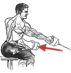 Выполнение - Сядьте на тренажер и упритесь грудью верхнюю часть скамьи. По необходимости, отрегулируйте высоту сиденья. Возьмитесь за рукоятки. Это стартовая позиция.