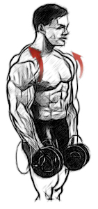 Во время выполнения следите за тем, чтобы руки оставались неподвижными. Двигаться должны исключительно плечи. Чтобы максимально растянуть мышцы, в нижнем положении старайтесь опустить гантели как можно ниже. Нейтральный хват задействует верхнюю часть трапециевидной мышцы, а прямой хват - среднюю. Можно скомбинировать два хвата вместе с помощью отведения плеч назад. В исходном положении держите гантели прямым хватом перед собой. Затем начинайте поднимать плечи и отводить их назад. В процессе этого движения хват меняется на нейтральный, а гантели уже располагаются по бокам бедер.  .jpg)